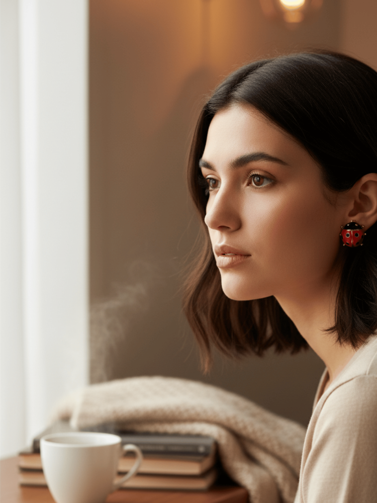 • أقراط بتصميم ليدي بيرد كبيرة ملونة.
