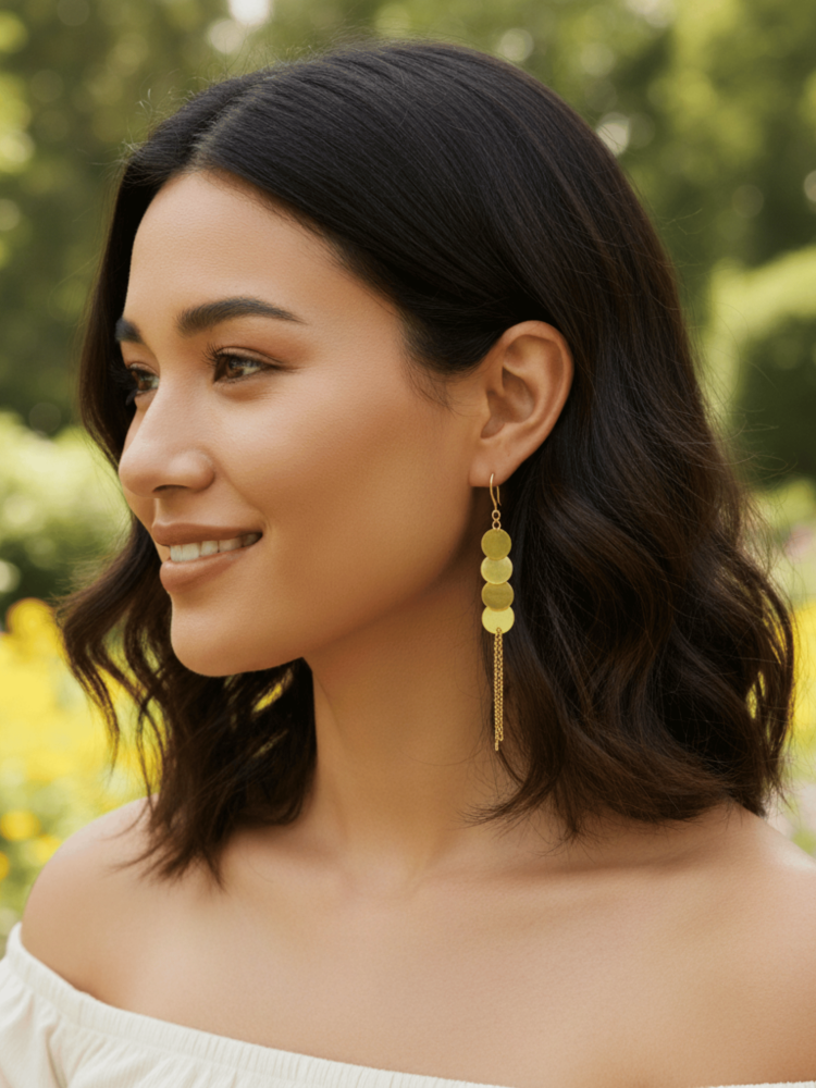 • أقراط طويلة بتصميم دوائر ذهبية متدلية.