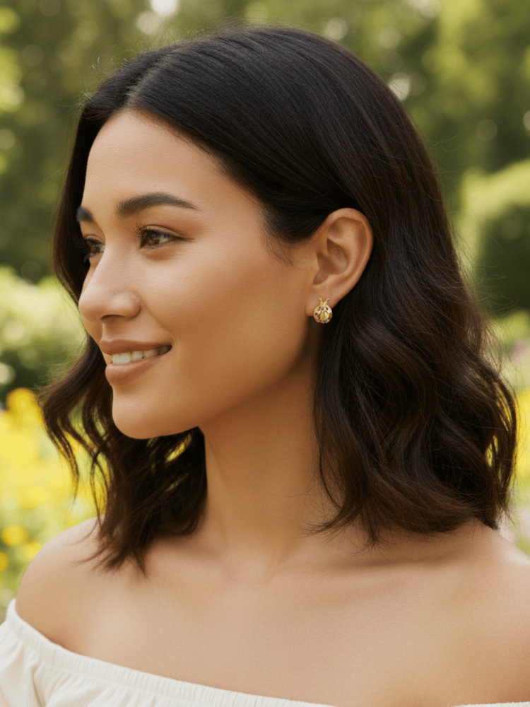 • أقراط بتصميم ليدي بيرد ذهبية صغيرة مرصعة بالزركون الملون.