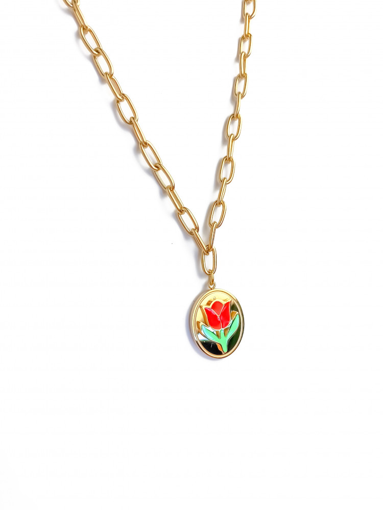 • عقد من سلسلة المشبك مع تعليقة وردة التوليب الاحمر.