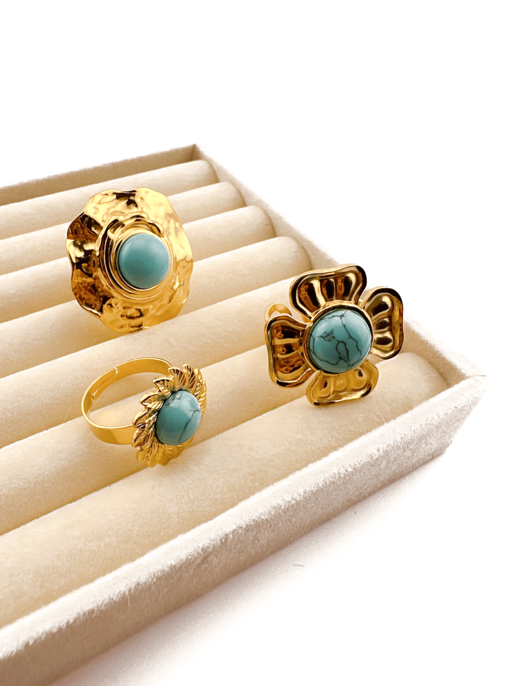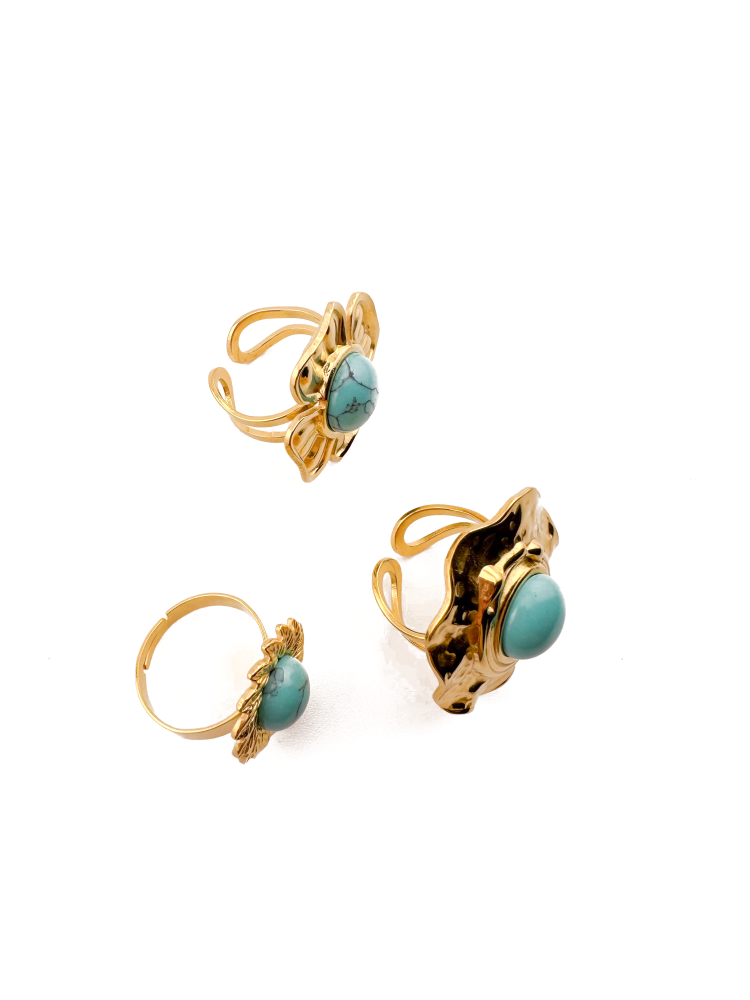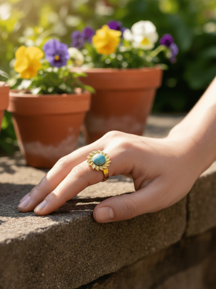 • خاتم بتصميم وردة ذهبية مرصعة بحجر فيروزي.