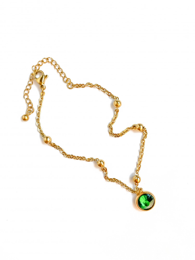 • خلخال من السلسة المربوطة بكرات صغيرة مع تعليقة بحجر أخضر.