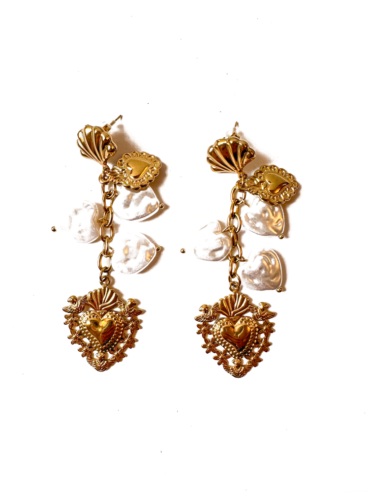 • أقراط طويلة بتصميم تعليقات قلوب و اصداف بيضاء على شكل قلوب.
