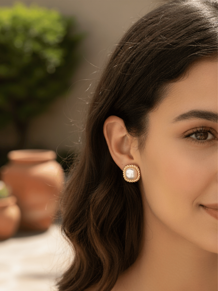 • أقراط بتصميم فنتج مربع مرصع باللؤلؤ.